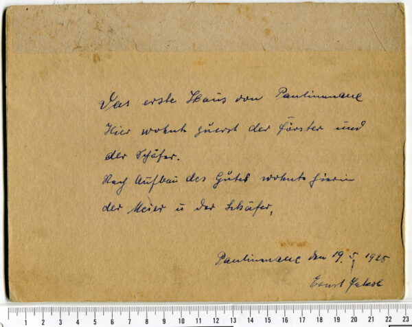 „Das erste Haus von Paulinenaue. Hier wohnte zuerst der Förster und der Schäfer. Nach Aufbau des Gutes wohnte hierin der Meier u der Schäfer.“