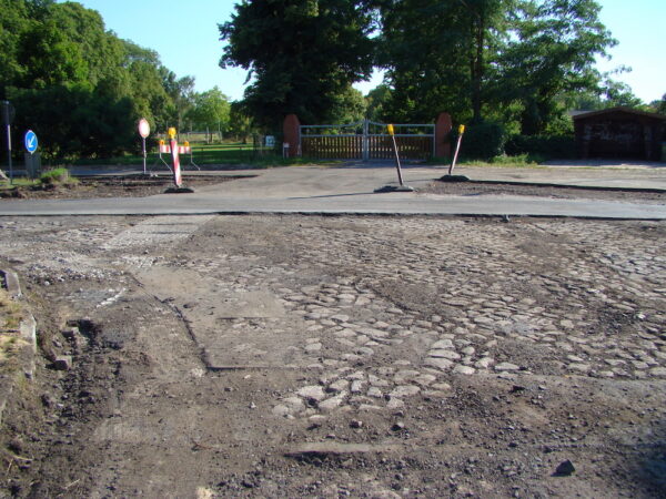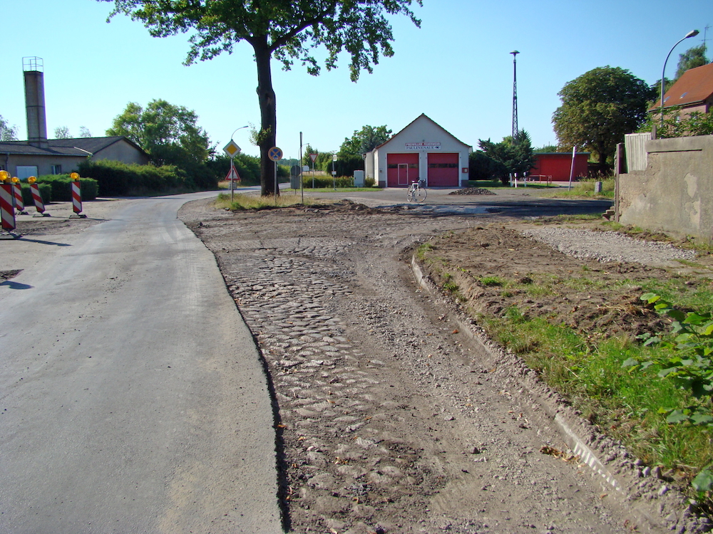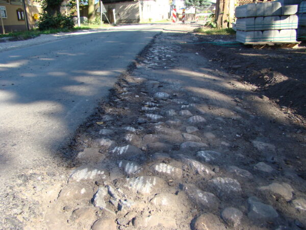 07.08.2008. Dass Paulinenaue ein Kind des 19. Jahrhunderts ist, kann man dank der Straßenbauarbeiten inmitten des Dorfes gerade auf anschauliche Weise erfahren. In Paulinenaue wird in diesem Jahr die durch das Dorf führende Kreisstraße HVL 12 erneuert. Die Aufhebung der Asphaltdecke bringt hier das historische Pflaster unter der Bahnhofstraße wieder zum Vorschein.