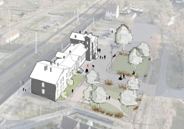 Die Lösung liegt nicht im „entweder-oder“, sondern im „und“ und damit in der Kombination von Programmen mit zum Teil flexiblen Grundrissen, die eine Nutzungsänderung ermöglichen. Als Umsteigepunkt zwischen Bahn, Auto und Bus, mit offenen Programmen im Erdgeschoss, Wohnungen unten und im Obergeschoss, einigen klar definierten Nutzungen und flexiblen Möglichkeitsräumen für die Zukunft – im und vor dem Haus – wird der Bahnhof als „dritter Ort“ entwickelt. So entsteht am Streckenkilometer 49 Raum für Gemeinschaft, Vereine, Dienstleistungen, Veranstaltungen und variable zusammenschaltbare Wohnungen, die das Angebot im Dorf erweitern und die wachsende Nachfrage bedienen können. Endlich kann man wieder durch das Gebäude zum Bahnsteig gehen und steht nicht abseits im Regen. Die Abstellflächen für Autos weichen in den nordöstlichen Bereich. Der Vorplatz vor dem Haupteingang wird eine Adresse zum Ankommen, Schatten und Grün inklusive.
