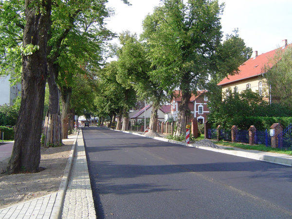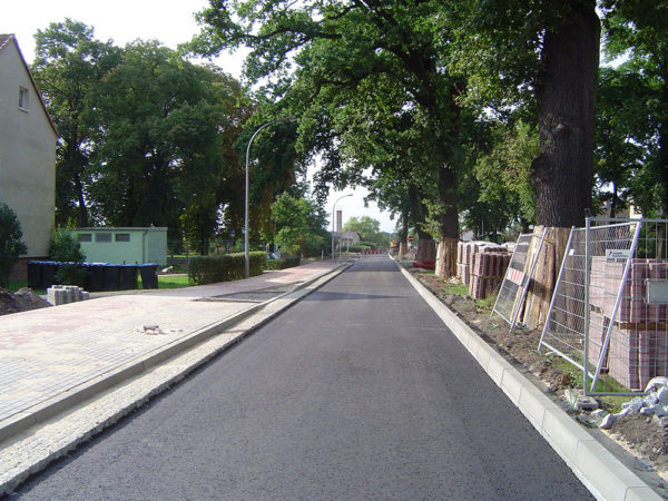 Hohe Kanten und ein gegenüber dem grauen Gehsteig sehr breit geratener Radweg, der angeblich Voraussetzung zum Erhalt von Fördermitteln war, hatten mancherlei Besorgnisse genährt. Bald wird sich zeigen, ob man mit der neuen Situation zufrieden sein kann. Foto: E. Schwarz, 2008.