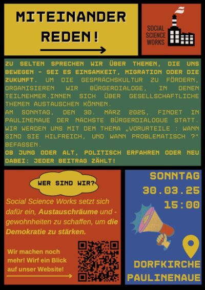 Ich bin im Nachhinein froh, dass wir es probiert haben. Denn es fanden sich genug Zustimmung und Unterstützung, um zu beginnen. Zuallererst von Pfarrer Michael Jurk, der nicht nur den Raum der frisch sanierten Kirche für die Dialoge öffnete, sondern als Gastgeber auch die Co-Moderatorenrolle und die Organisation vor Ort übernahm. Zuallerallererst aber ist Professor Hans Blokland vom gemeinnützigen Unternehmen Social Science Works zu nennen, der im September 2024 die Mail geschrieben, der Paulinenaue dann zum Gemeindegründungsjubiläum im November besucht hatte und tatsächlich am 12. Januar 2025 den ersten Bürgerdialog „Miteinander reden“ einleitete.
