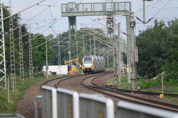 Einfahrt einer ODEG am Vormittag. Im Hintergrund ist die Baukulisse zu erkennen. Foto: J. Scholz, 2025.