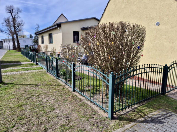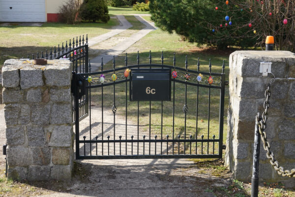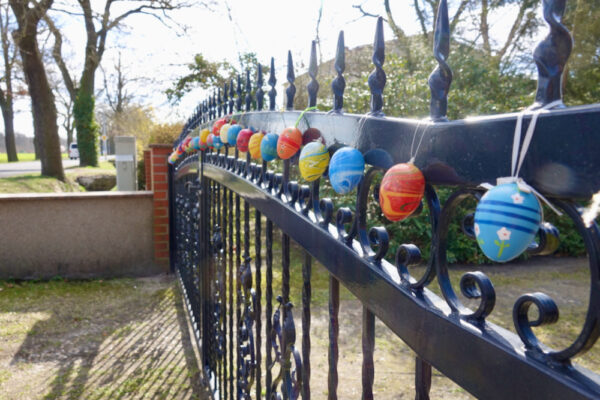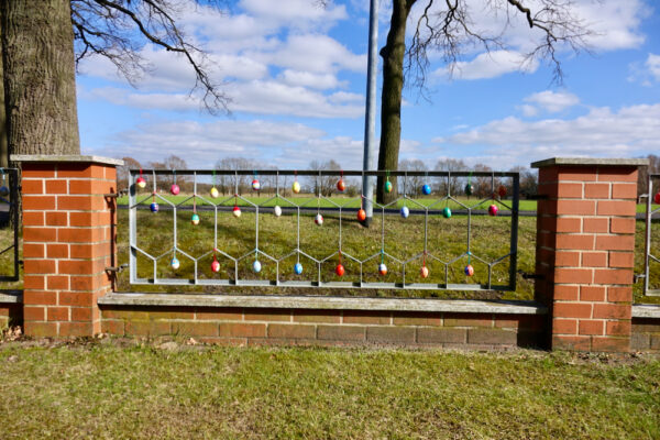 Nach herzlichen Glückwünschen geht es noch einmal zurück ins Dorf, um einer Beobachtung nachzugehen, die wir zuvor in der Brandenburger Allee gemacht hatten. An auffällig vielen Grundstücken hängen nämlich in diesem Jahr bunte Ostereier nicht nur an Sträuchern und Büschen, sondern auch an Zäunen.