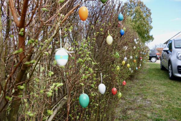 Eine gute Idee. Wie man sie auch dort umsetzen könnte, wo keine dekorativen Zaunspitzen zur Verfügung stehen, beweist gleich nebenan Gundel Hölzel, die ihre Hecke mit Urenkelin Paula schon frühzeitig mit zahlreichen Eiern geschmückt hat. Auch das sieht richtig schön aus!