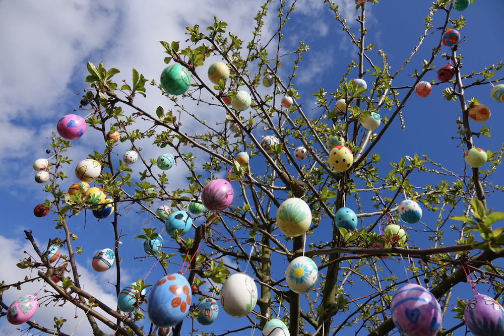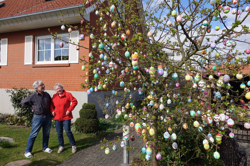Das ist der Osterstrauß des Jahres 2026 und er steht bei Familie Schwarz. Was am Baum zu sehen ist, sei ein Werk von fünf Jahren, erzählt Jutta Schwarz. Wie man es auch von anderen Sträußen in der Nachbarschaft kennt, ist hier jedes Motiv ein handbemaltes Unikat. Die Eier glänzen im Sonnenschein. Nach einem Regenguss stelle sich ein besonders schöner Effekt ein, so Jutta. Wenn nämlich Tropfen an den kleinen Kunstwerken hängen und später die Sonne darauf scheint.