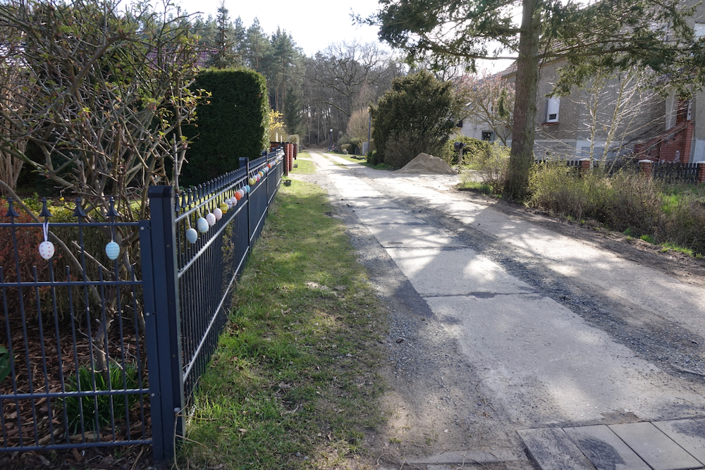 Nach herzlichen Glückwünschen geht es noch einmal zurück ins Dorf, um einer Beobachtung nachzugehen, die wir zuvor in der Brandenburger Allee gemacht hatten. An auffällig vielen Grundstücken hängen nämlich in diesem Jahr bunte Ostereier nicht nur an Sträuchern und Büschen, sondern auch an Zäunen.