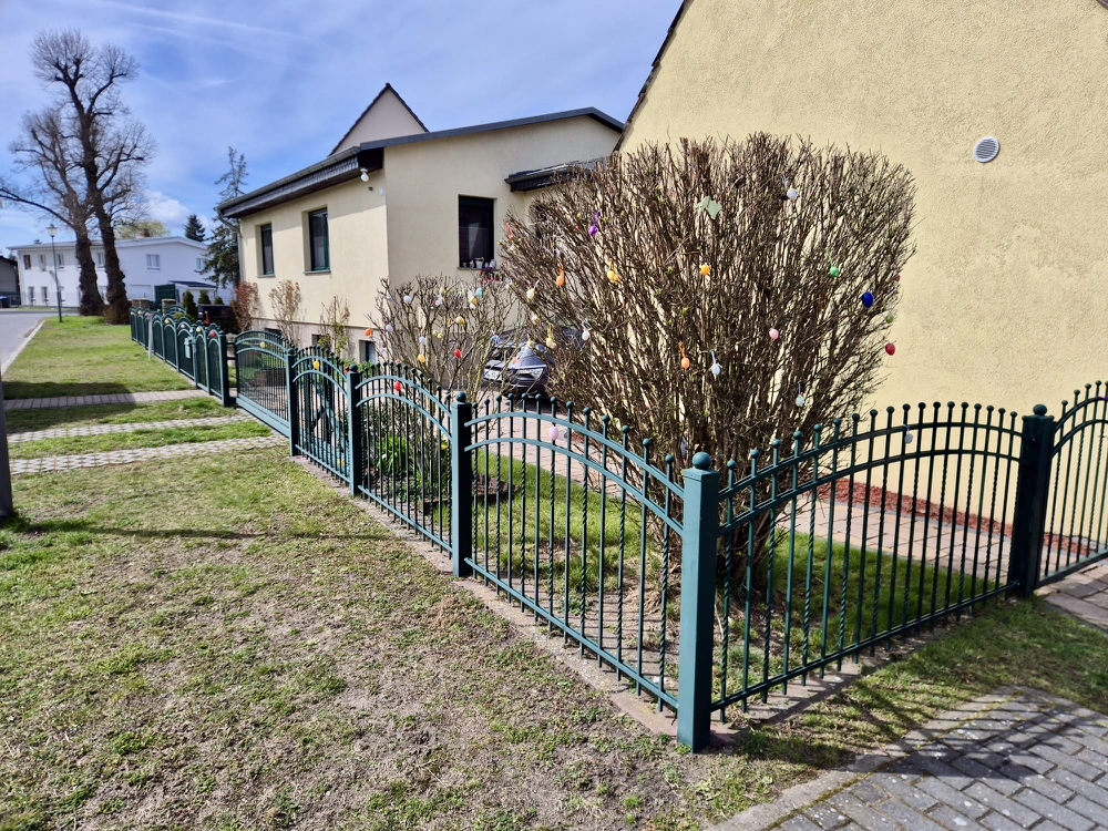 So kreativ die Zaunvarianten in der Brandenburger Allee sind: Dörte Janke und Konstanze Mietz erzählen geradeheraus, dass sie die Inspiration dafür in der Waldstraße erhalten haben. Hier, bei Familie Weishaupt, stößt man dann auf den Zaun, der wohl am Anfang dieser neuen Variante gestanden hat. Ich frage nach bei Katinka Weishaupt, die im Haus eine Heilpraxis führt und bei den Pauerfrauen aktiv ist.