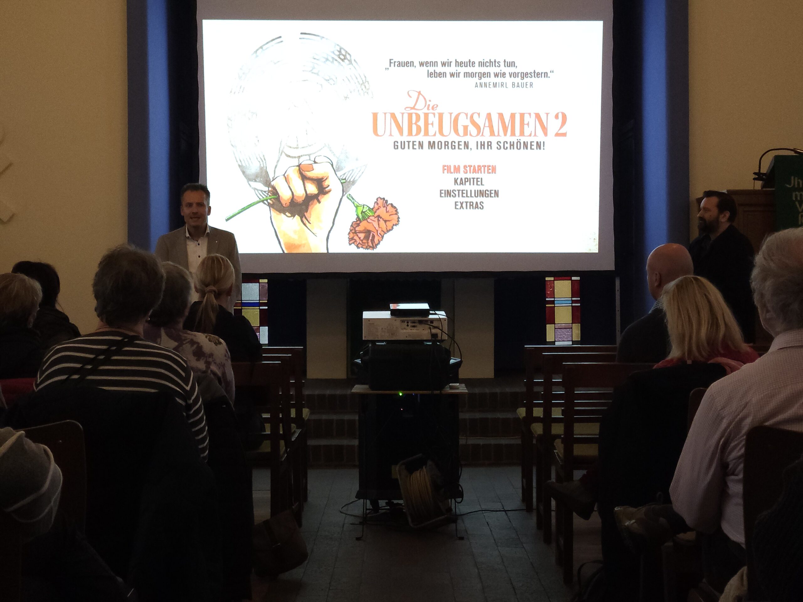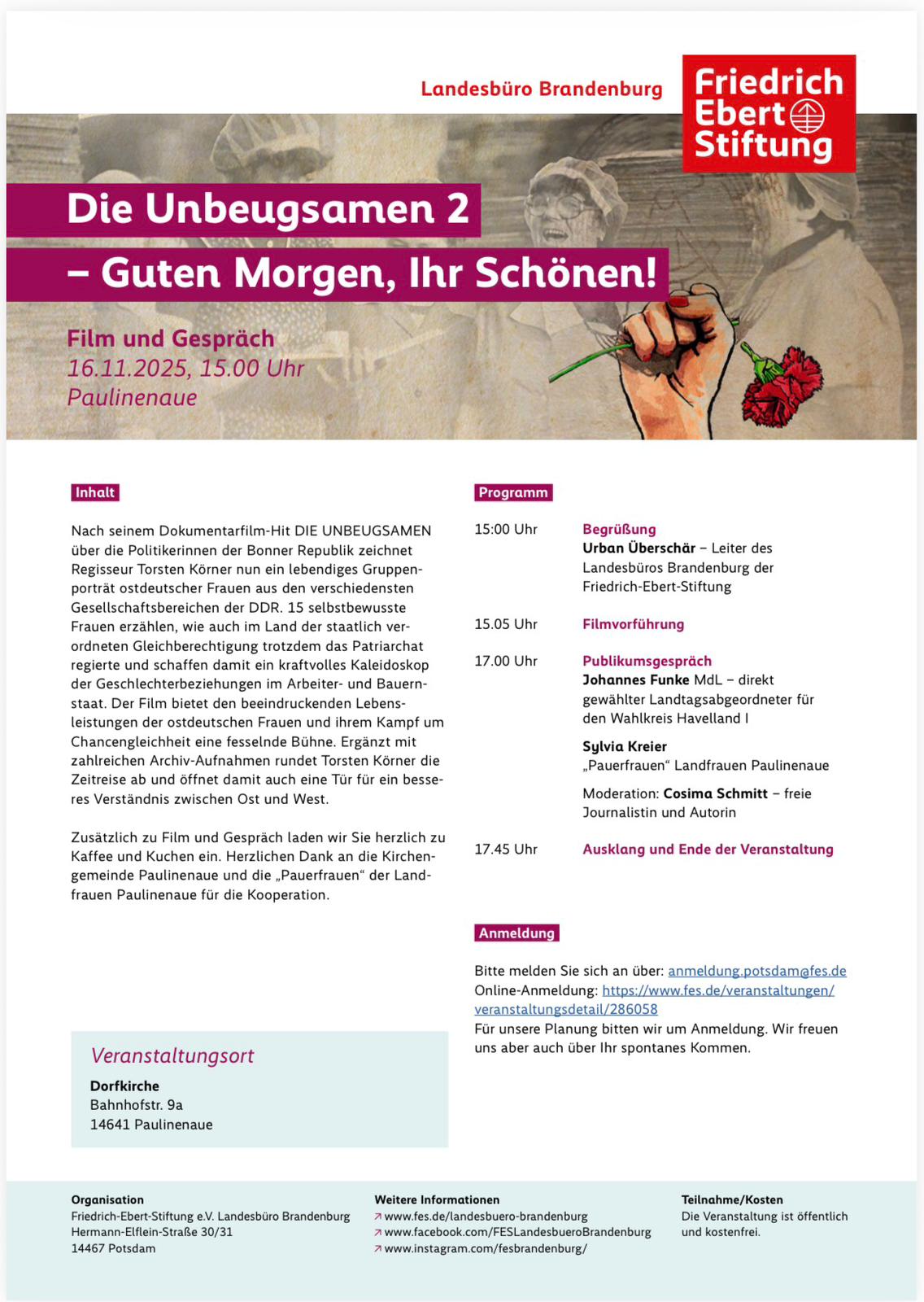 Am 16. November fand in unserer Dorfkirche eine besondere Veranstaltung statt, zu der die Friedrich-Ebert-Stiftung gemeinsam mit der Kirchengemeinde Paulinenaue und uns Pauerfrauen eingeladen hatte. Trotz des unbeständigen Wetters fanden rund 30 Interessierte – überwiegend Frauen – den Weg in die Kirche, um den Dokumentarfilm „Die Unbeugsamen 2 – Guten Morgen, Ihr Schönen!“ zu sehen und anschließend miteinander ins Gespräch zu kommen.