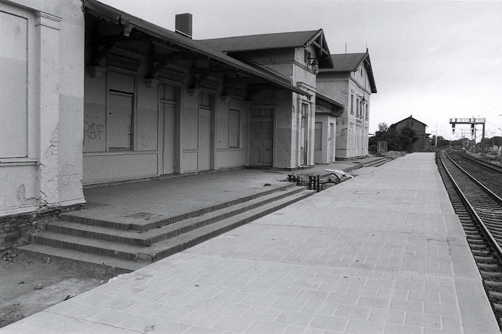Im August 2003 wird der Bahnsteig des Paulinenauer Bahnhofs für schnelle Vorbeifahrten gesichert. Foto: J. Scholz, 2003.