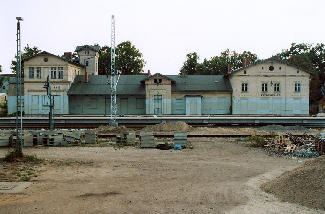 10.08.2003. Am Bahnsteig des Paulinenauer Bahnhofes wird dieser Tage eine breite Plattform verlegt. Ein Sicherheitszaun entsteht hier zum Schutz der Wartenden vor den bald wesentlich schneller durchfahrenden Zügen. Der Zaun wird Durchgänge zum Betreten der Regionalbahnen erhalten. Die hochmoderne Anlage ist bundesweit ein Novum.
