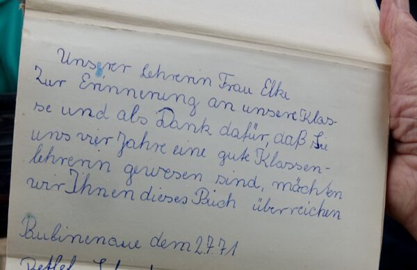 Frau Elke versicherte, dass sie das vor über 50 Jahren übergebene Buch in Ehren hält. Die ganze Klasse hatte darin unterschrieben. Foto: J. Scholz, 2025.
