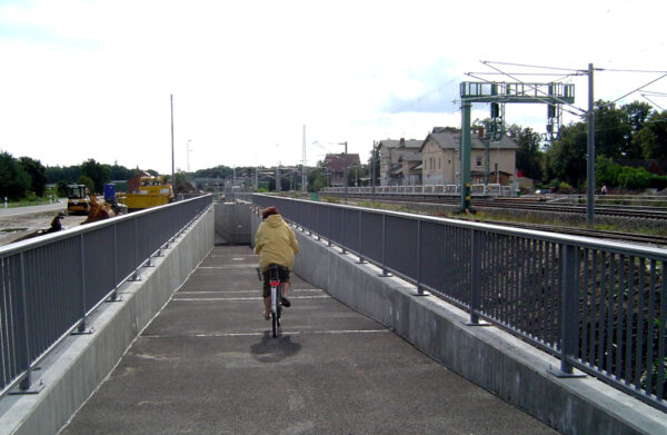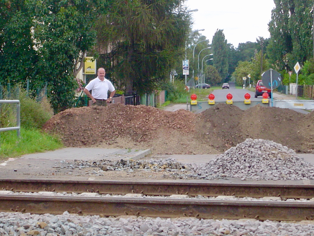 10.09.2004. Die Überquerung der Eisenbahnlinie ist für Kraftfahrzeuge seit dem Nachmittag des 10. September 2004 nur noch über die neu erbaute Brücke möglich. Der seit über 150 Jahren bestehende Bahnübergang an der Ruppiner Straße ist geschlossen worden.